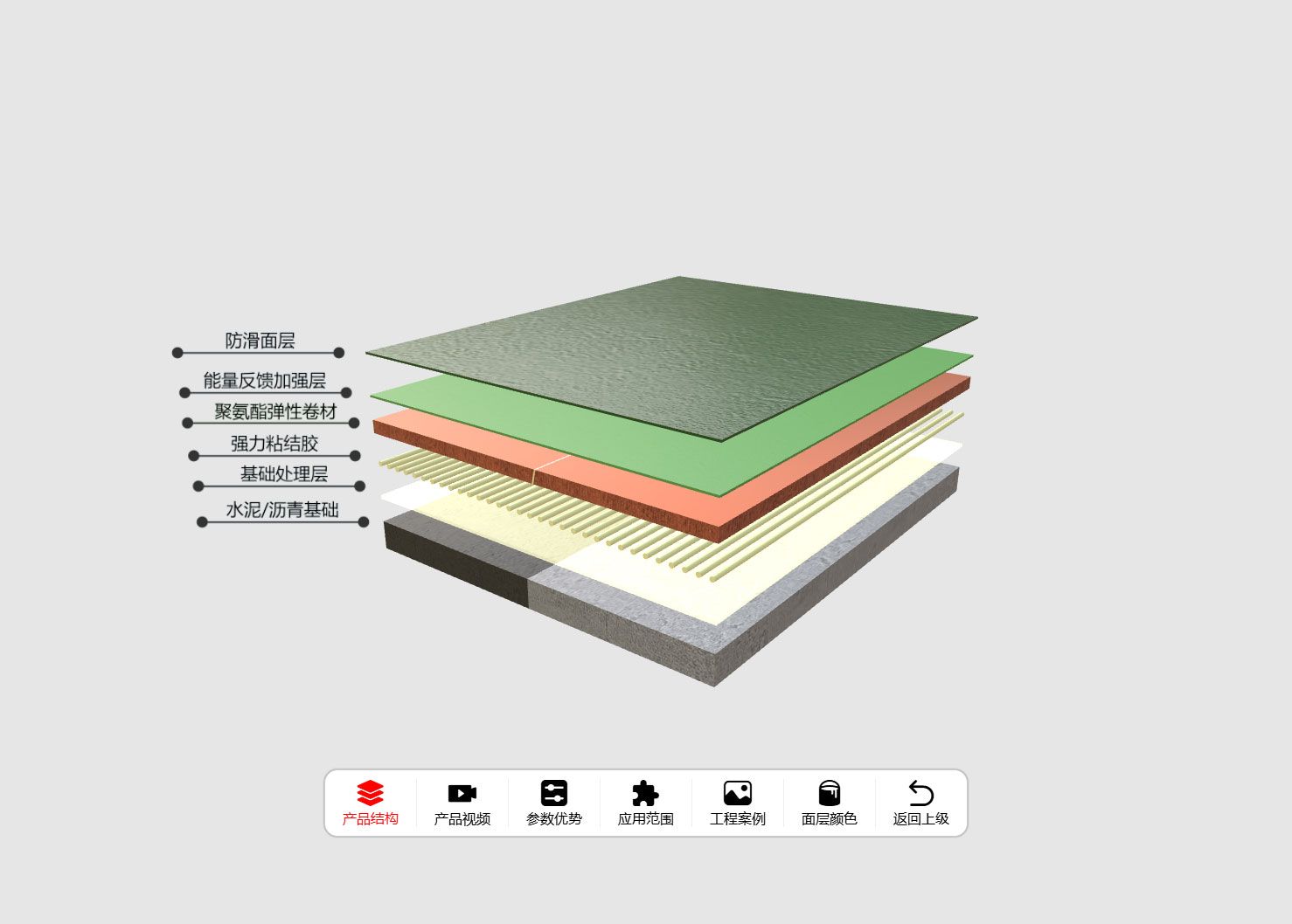 VR云展科技平臺為長河化工實業集團制作的球場材料產品3D交互方案,以3D數字化展示形式,全方位呈現半預制型硅PU球場材料的產品結構、產品視頻、參數優勢、場景應用、工程案例、面層顏色。